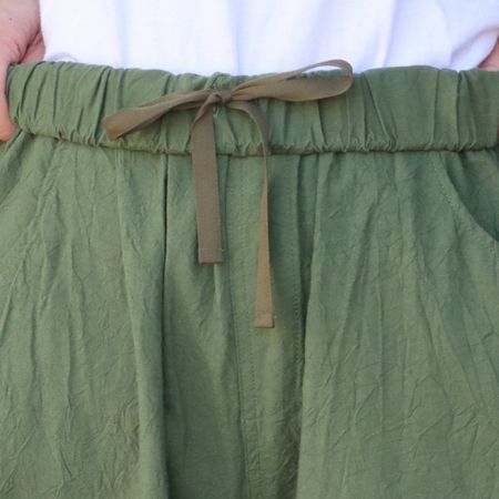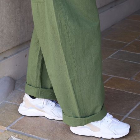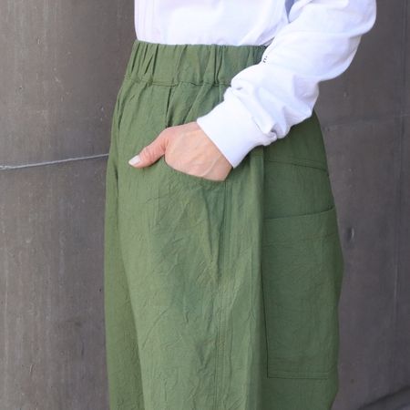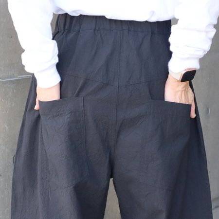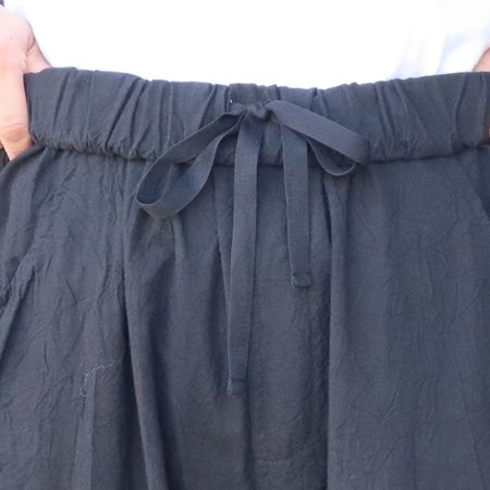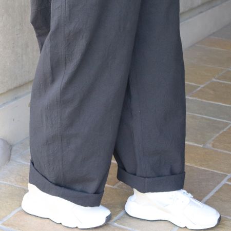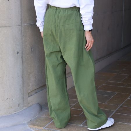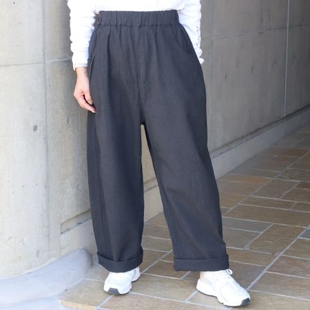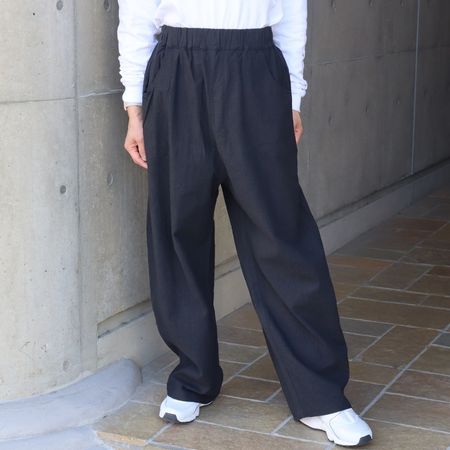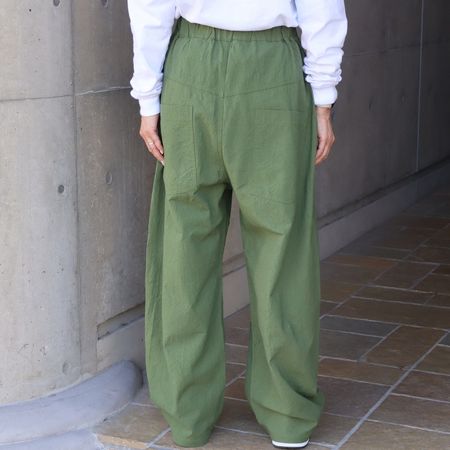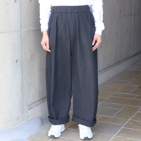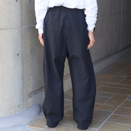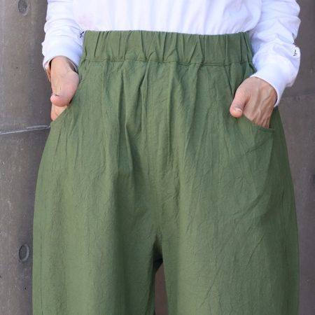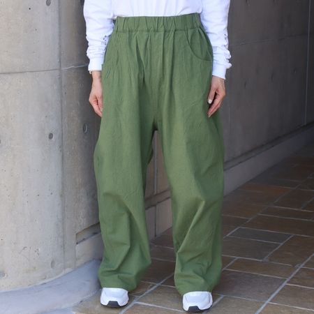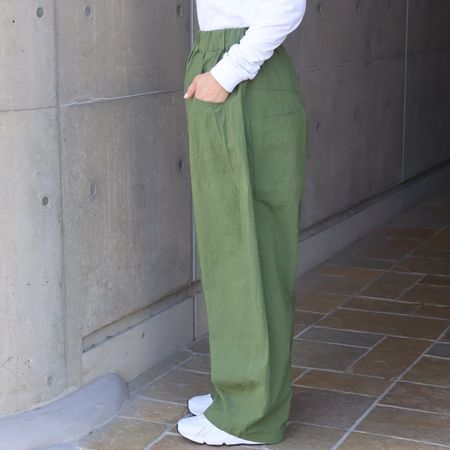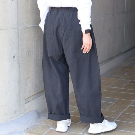 ■ウエストはゴム仕様+コード付きで着脱も簡単に。股上が深めのハイウエストでヒップ回りをしっかり包み込み安心感のある穿き心地。深めのポケットで使い勝手抜群。柔らかな風合いとナチュラルなシワ感が特徴のシーチングワッシャー生地を使用したワイドパンツ。