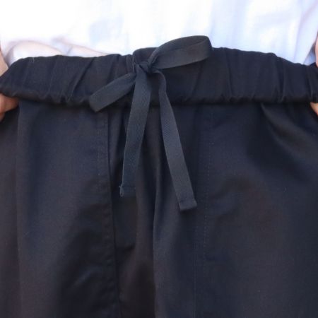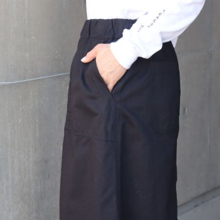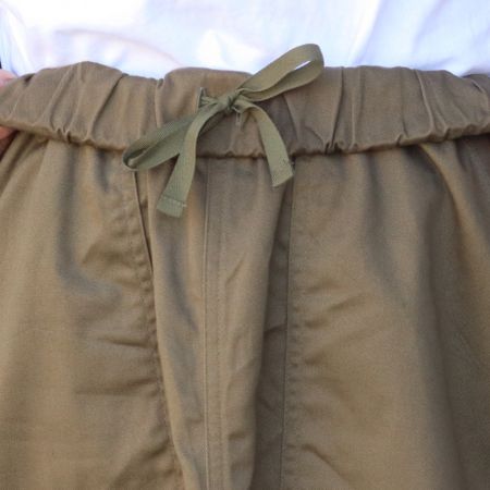 フロントの大きなベイカーポケットが、シンプルな中にさりげないアクセントを添え、こなれた印象に仕上げてくれます。ウエストは総ゴム仕様で、内側の紐でサイズ調節も可能。後ろポケット付きで、実用性とカジュアル感を兼ね備えた一着です。