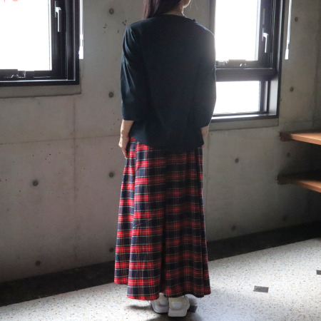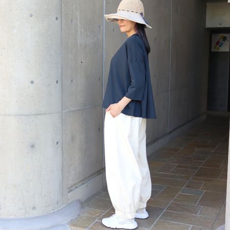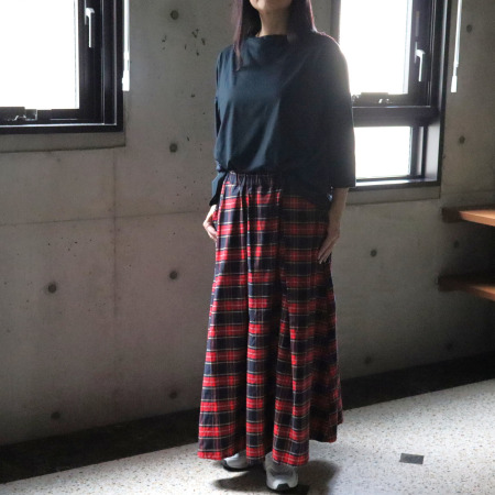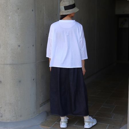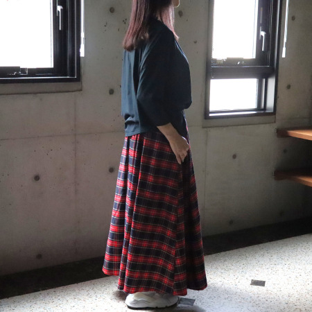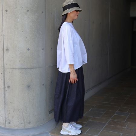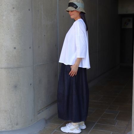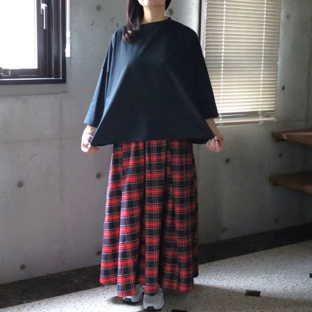 裾にかけてゆるやかに広がるAラインは、腰まわりを自然にカバーし、体形を気にせず着られるのも嬉しいポイント。前後差のある裾ラインは横からのシルエットをすっきりと見せ、程よくゆとりを持たせたリラックスシルエットながらも上品な印象に仕上がります。