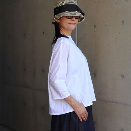 高品質な110/2サイロプレミアム糸を使用し、ガス焼き加工で毛羽を極限まで抑えたクリアな表面感が特徴。洗濯を繰り返しても毛羽立ちが少なく、美しい風合いが長続きします。さらに、自然な接触冷感とUVカット機能を兼ね備えているので、シーズンを通して快適にご着用いただけます。