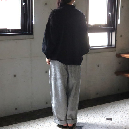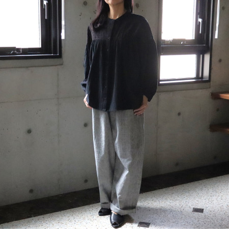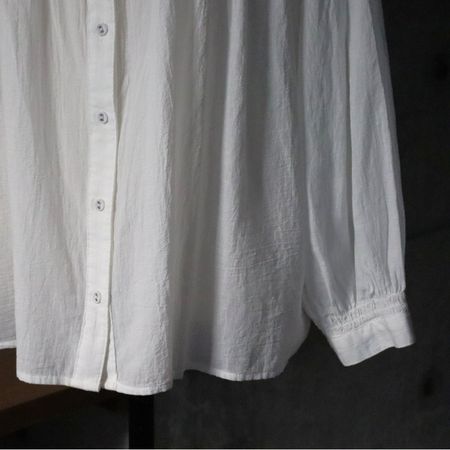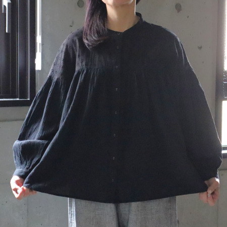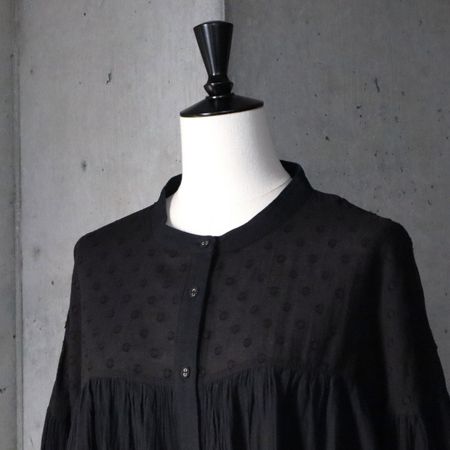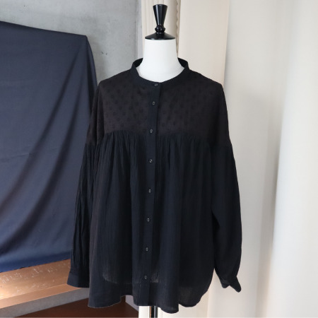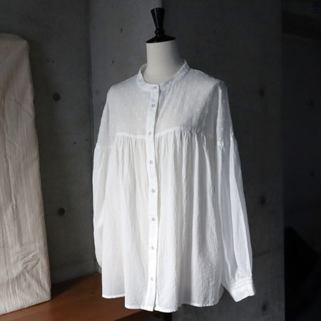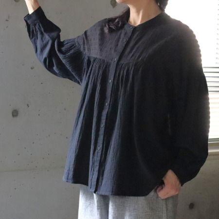身頃から袖にかけてたっぷりと寄せたギャザーが、ふんわりと優しい雰囲気を演出します。袖口のシャーリングが自然な立体感を生み、動くたびに軽やかな表情に。透け感のあるドット模様が甘さを添えながらも、くるみボタンの上品さで大人の装いにしっくり馴染みます。