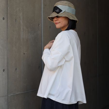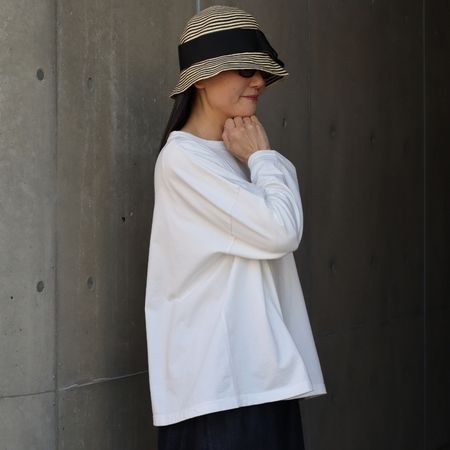 素材には、きゅっと細かく編み立てたクラシック天竺を使用。程よい厚みとハリ感がありながら、優しく肌になじむ柔らかさが魅力です。毛羽立ちが少なく、洗濯を繰り返してもさらりとした質感が続くので、日常づかいにぴったり。裾や袖口はダブルステッチでしっかりと縫製されており、丈夫さときれいな仕立てを兼ね備えています。