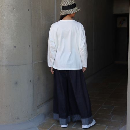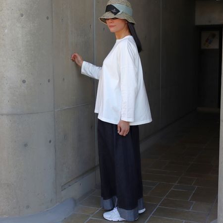 程よい身幅感と、裾に向かってゆるやかに広がるシルエットが、リラックスした着心地を叶えつつ、すっきりとした印象に仕上げます。肩まわりはドロップショルダー仕様で、自然に肩幅をカバー。大人の抜け感を演出します。