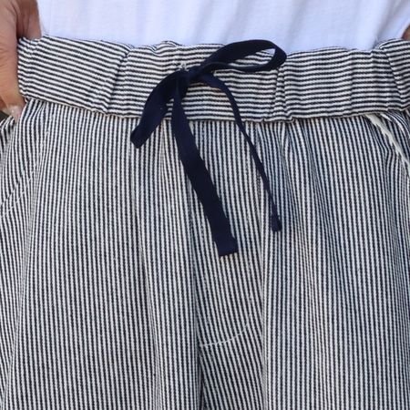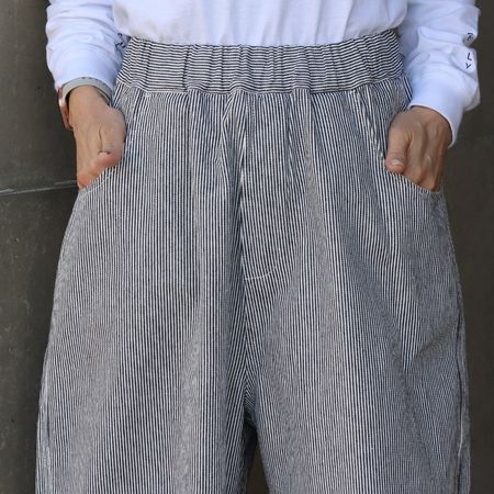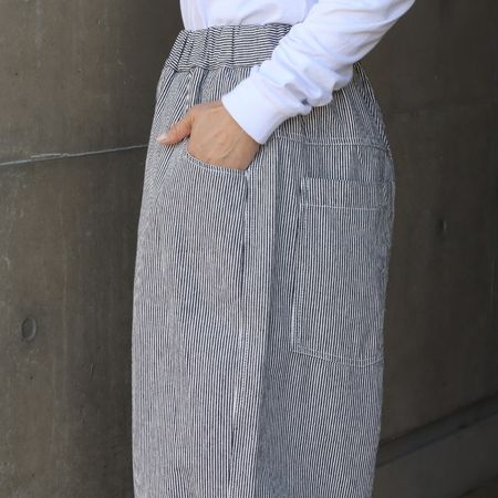 ヒッコリーデニムといっても、硬すぎず軽やかな穿き心地。柔らかく滑らかな糸を用いた素材は、色落ちしにくく、ご自宅でのお手入れも簡単です。ゆったりとした穿き心地ながら、テーパードのきれいなラインでシルエットはすっきり。ウエストは総ゴム仕様でストレスフリーにフィットし、紐でしっかり調整も可能。サイドポケットに加えて、ヒップには手がすっぽり収まる大きめポケットを配置し、機能性も抜群です。