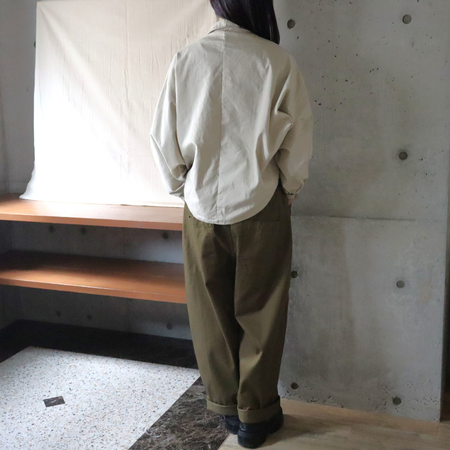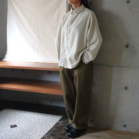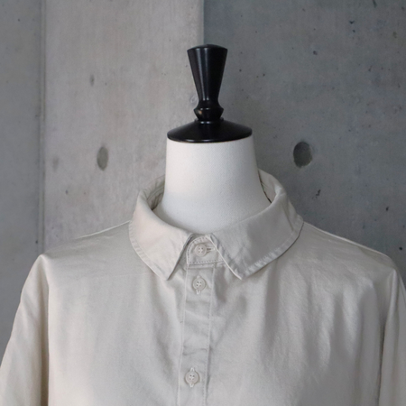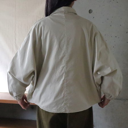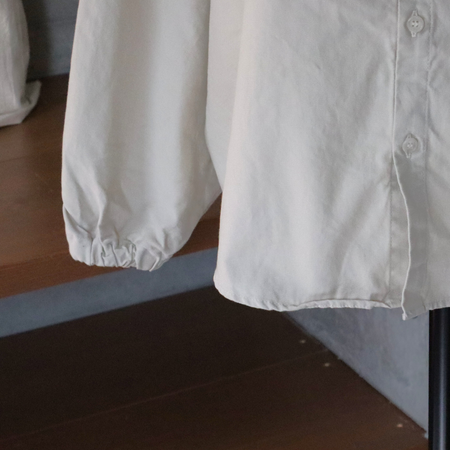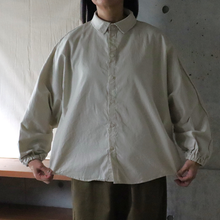 ■ハリのあるオックス生地を使用した、上品で抜け感のあるオックスドルマンシャツ。肩のラインを落としたゆったりとしたドルマンシルエットは、肩まわりや二の腕をさりげなくカバーし、自然とリラクシーな雰囲気に。袖口にはシャーリングを施し、手首を細見えさせる効果と女性らしいニュアンスをプラスしました。