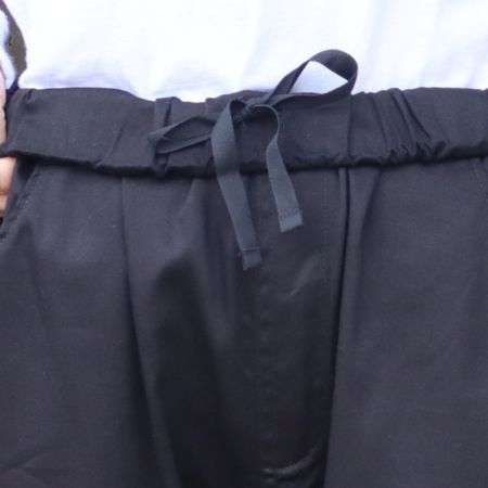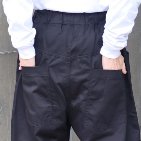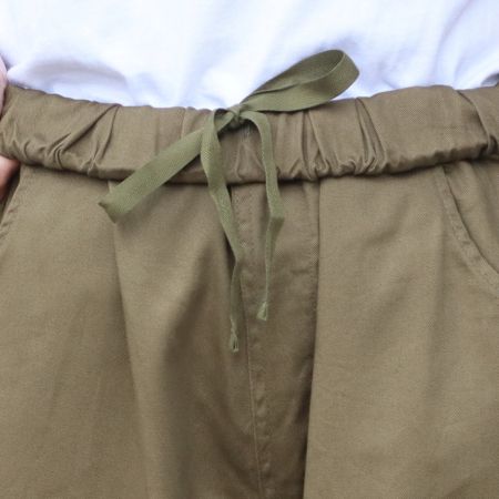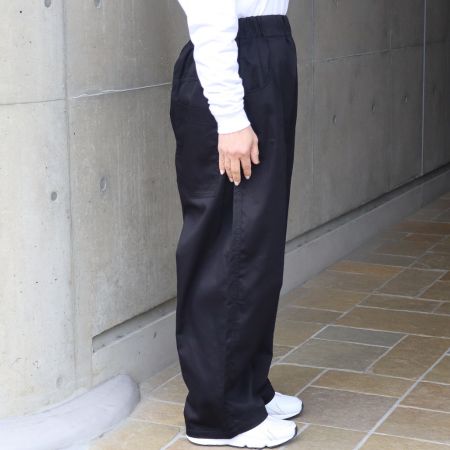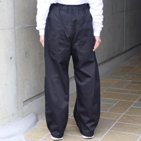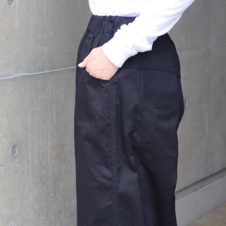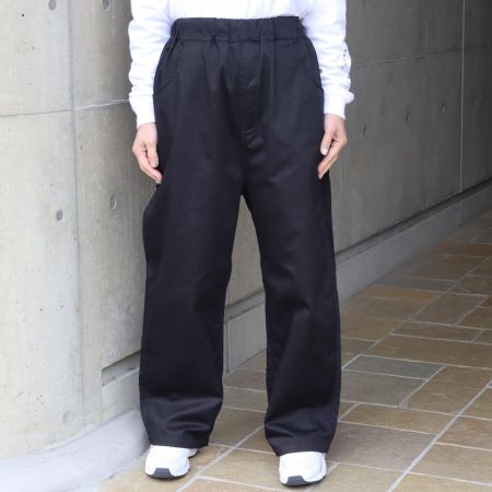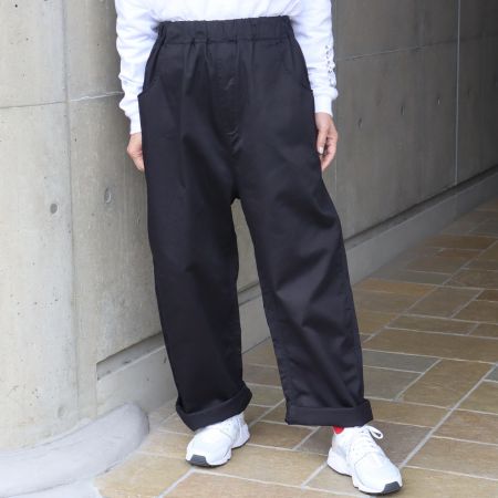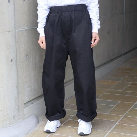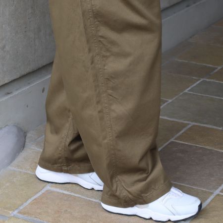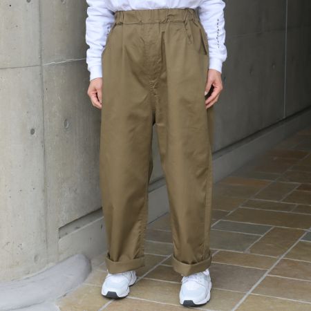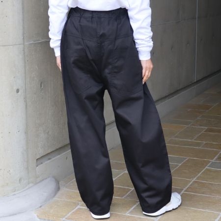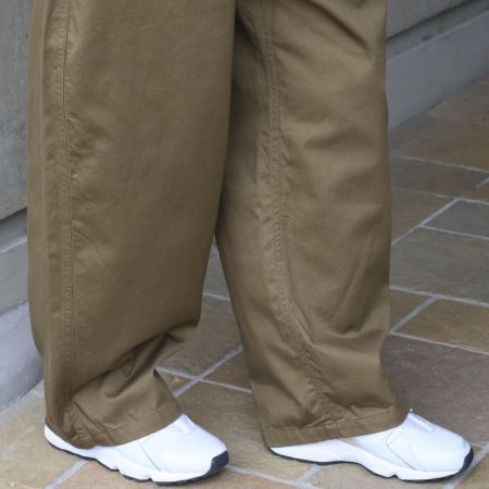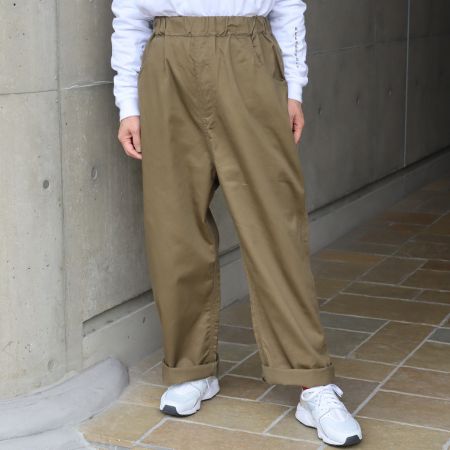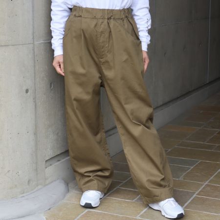 ウエストは総ゴム仕様で快適な穿き心地を叶えつつ、紐での微調節も可能。後ろポケットを低めに配置することで、自然なルーズ感とこなれた雰囲気を演出しています。ゆったりとしたワイドストレートのシルエットは、体型を拾わずリラクシーに着こなせる一方で、ツイルの適度なハリ感がきちんと感もプラス。