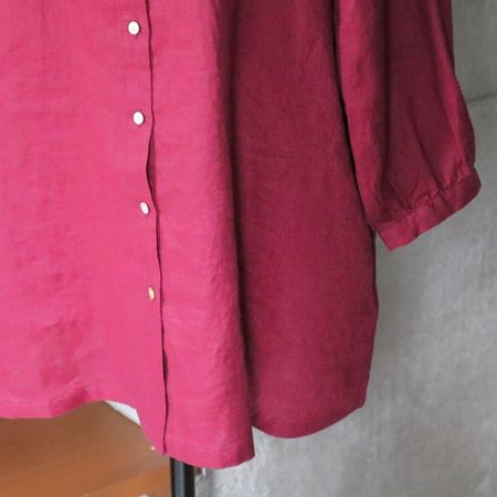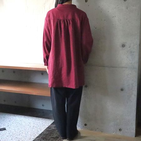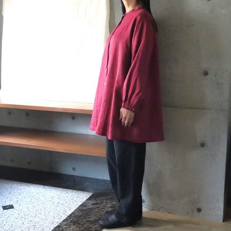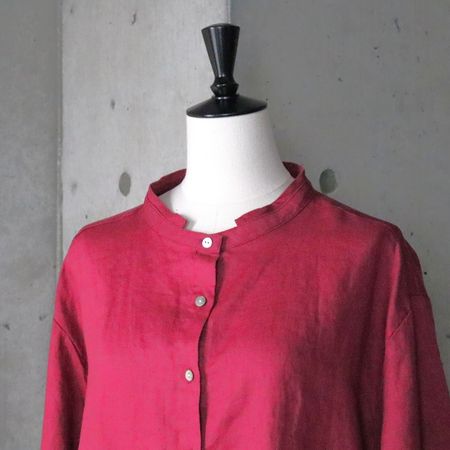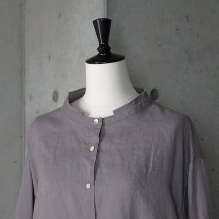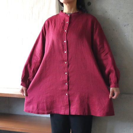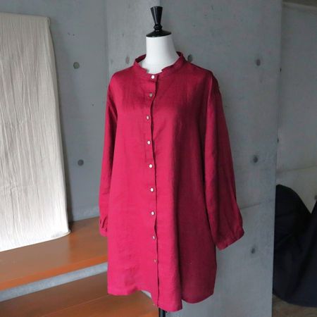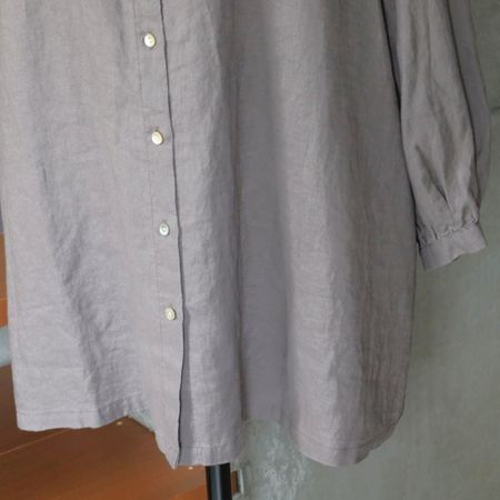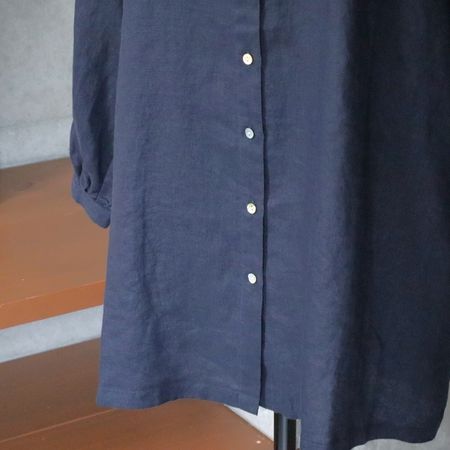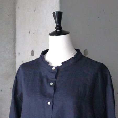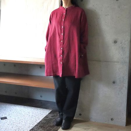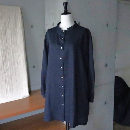 ■ネップのある自然な風合いが魅力のリネン生地で仕立てた「チビスタンド襟チュニック」。