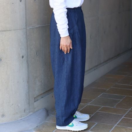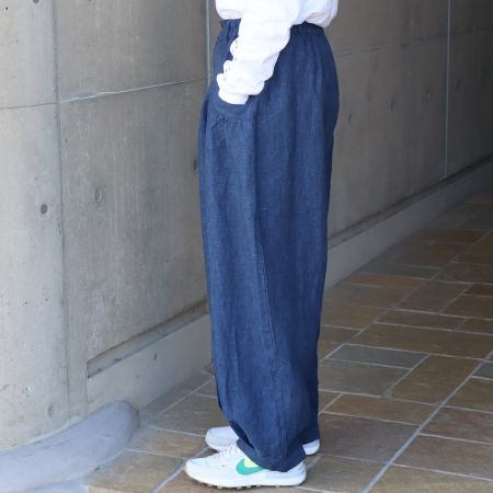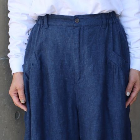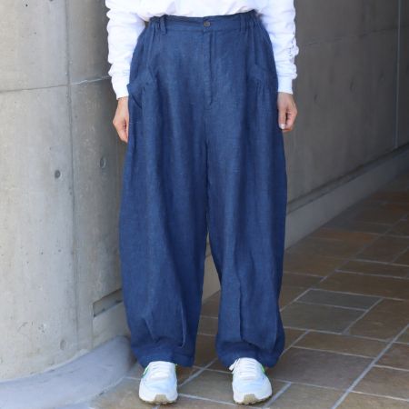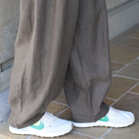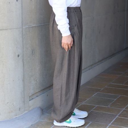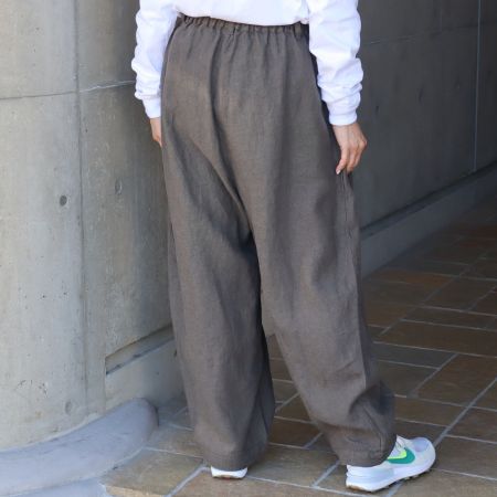 ■ほどよい厚みのあるリネン素材を使用したギャザーポケットのタックパンツ。