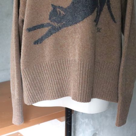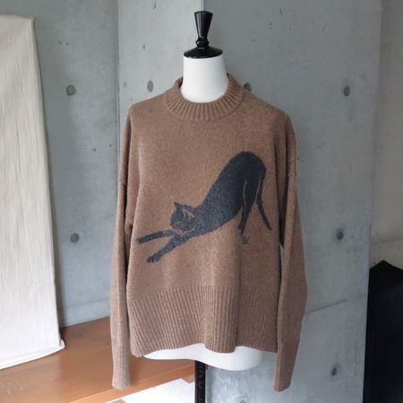 ゆったりと気ままに伸びをする猫の姿を、フロントに大胆に描いた一枚です。ウールをベースにコットンを少しブレンドした素材は、ふんわりと軽く、あたたかみのある風合い。