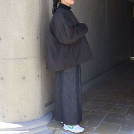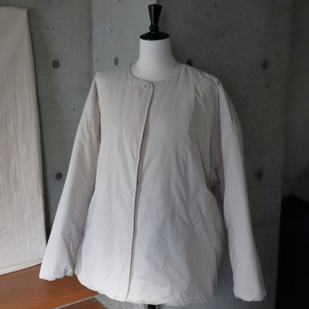 首元をすっきり見せるノーカラーデザインで、タートルやマフラーなどとの相性も抜群です。第一ボタンのみが表に見えるデザインで、他はすべて内側のくるみスナップ仕様。ミニマルな印象の中にも、さりげないこだわりが光ります。
