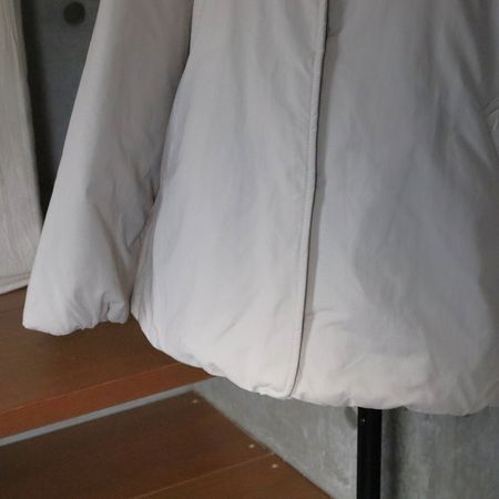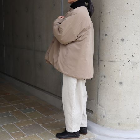 ■ふっくらとしたハリ感が魅力のピーチ起毛素材を使用した、中綿入りのノーカラーレギュラーコート。
