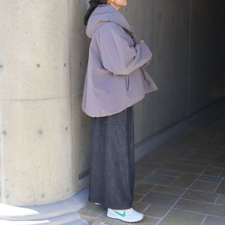 ■ふっくらとハリのあるピーチ起毛素材を使用した、中綿入りのフードショートコート。