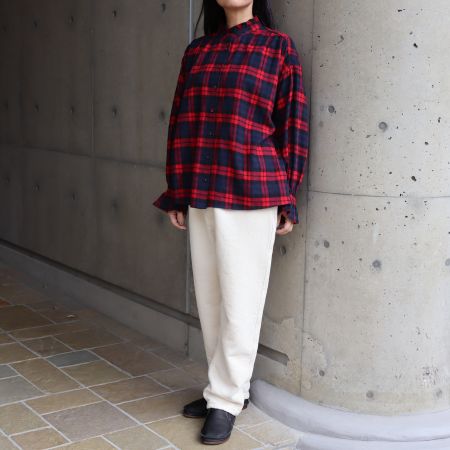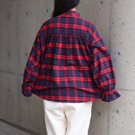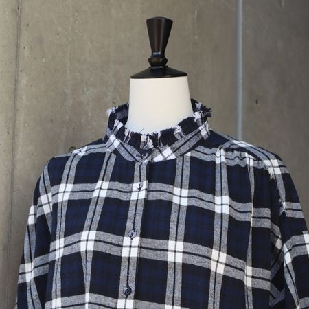 ■肌触りの良い柔らかなコットン素材を使用した、あたたかみのある起毛チェックのフリルカラーブラウス。