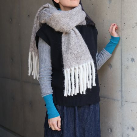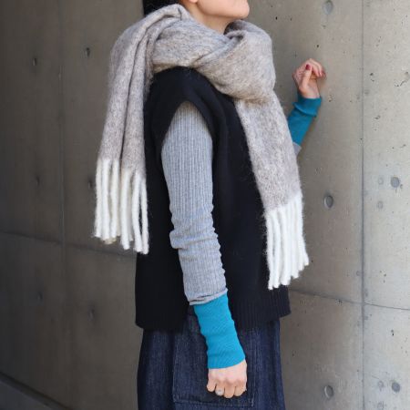 サイズは50×220cmの大判仕様で、肩にかけても首元にぐるりと巻いてもボリュームが出て、暖かさと上品さをしっかり両立。