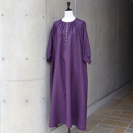 ■フロントにずらりと並んだボタンが、シンプルなシルエットに豊かな表情を添えるギャザーワンピース。