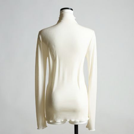 ネックラインを優しく包み込むハイネックデザインです。ネックの高さは高すぎず、ソフトなフィット感にこだわりました。アウターの襟元から見えても肌着っぽくなく、着こなしをさりげなく引き立ててくれます。