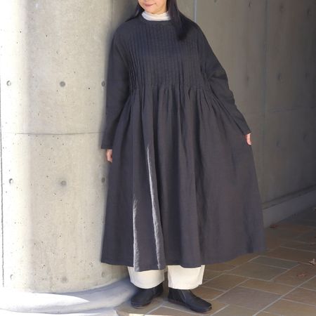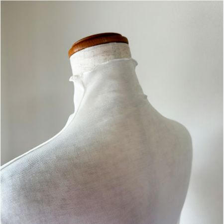 ベールのように薄い生地感に合わせて、細いオーバーステッチを使用しています。繊細な素材感を活かすため、できる限り縫製を少なくした仕上げにしています。
