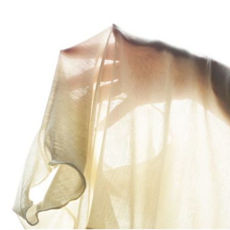 この細さの糸で、フライス編みに仕上げました。100%シルクで、半透明の透け感、滑らかな肌心地は、世界に1つの素材となりました。優しく伸びて包み込むようにボディにフィットする感触です。