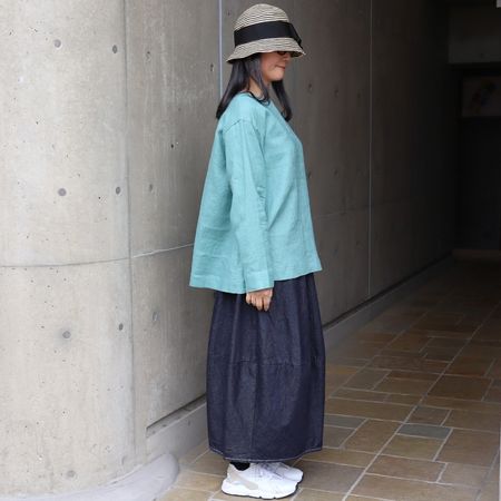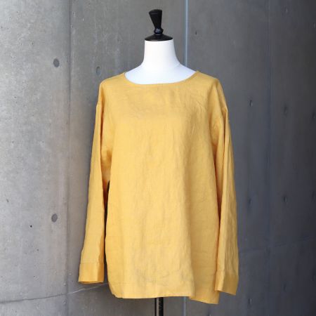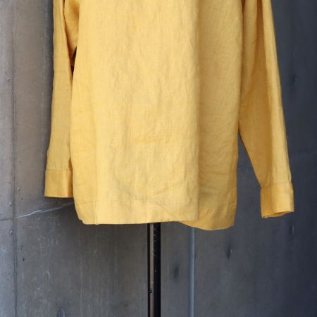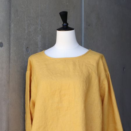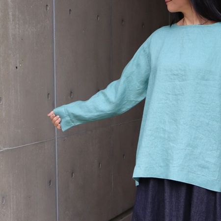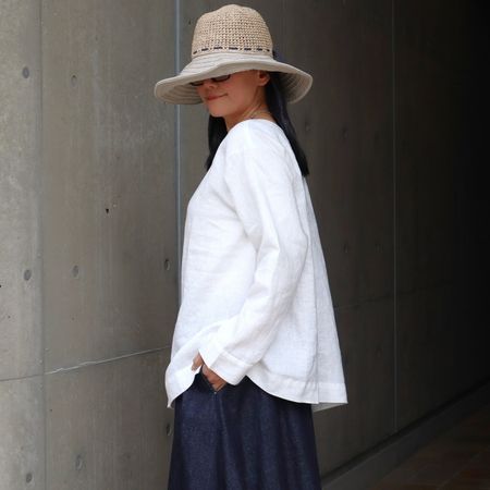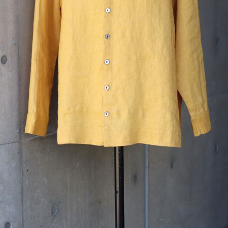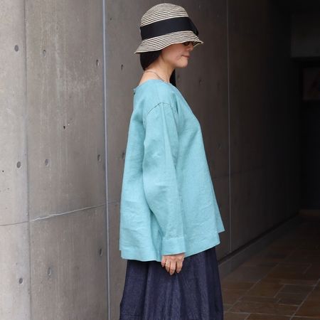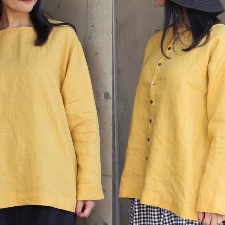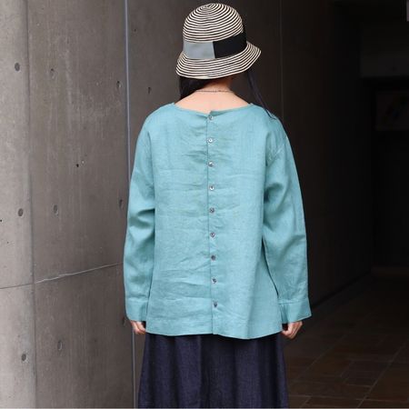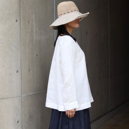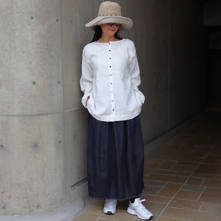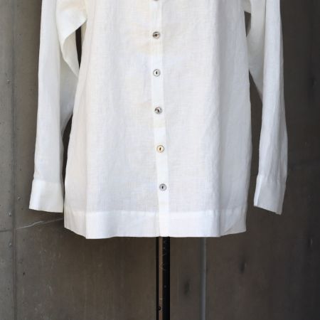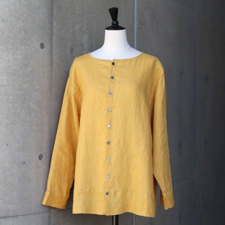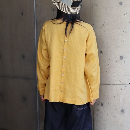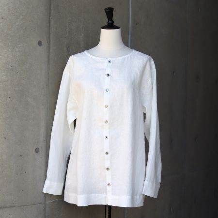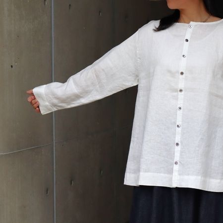 ■自然なシワ感が味わい深い、14番手リネンで仕立てたノーカラーブラウス。