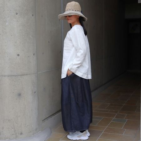 ほどよい厚みとシャリ感のある風合いで、さらりと心地よく、着るほどに体になじむ素材です。