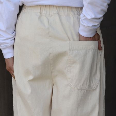 ウエストはオールゴム+内側紐仕様で楽ちん。両サイドポケットと後ろポケット付きで実用性も備えています。