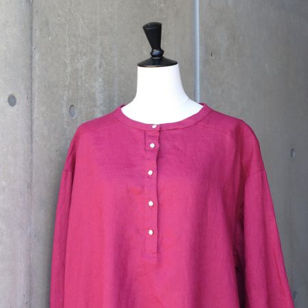 首元をすっきり見せるヘンリーネックと、手元にやさしい表情を添えるボリューム袖がポイント。