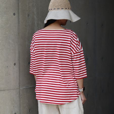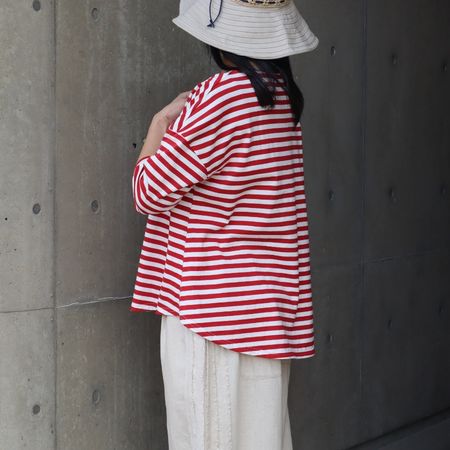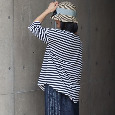 程よいハリと柔らかさを兼ね備えたコットン100%素材。双糸(2本の糸を撚り合わせた糸)ならではのなめらかさがあり、カジュアルなボーダーでもどこか上品な印象に仕上がります。洗濯後も縮みや型崩れが起きにくいのも嬉しいポイントです。