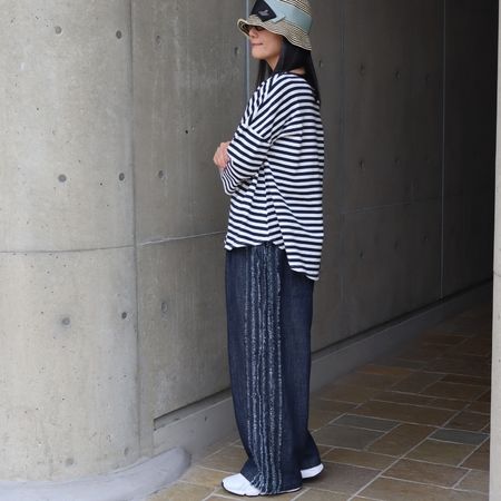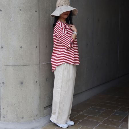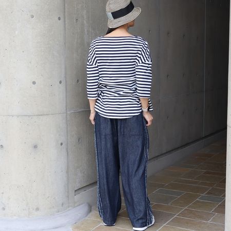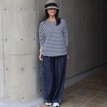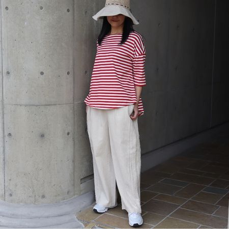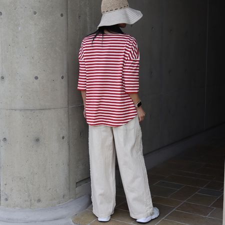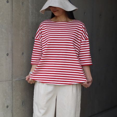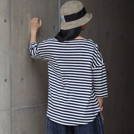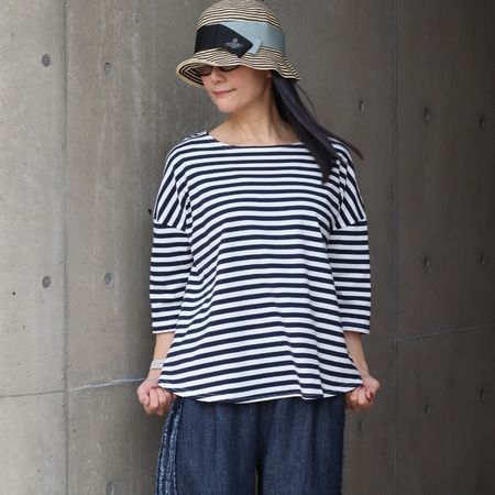 ボーダーは太すぎず細すぎない絶妙なピッチで、大人にも似合う落ち着いた雰囲気に。首元はすっきりと見せてくれるボートネック仕様で、女性らしさもプラスしています。