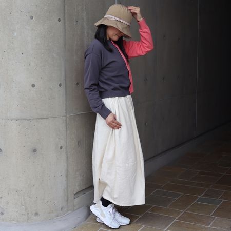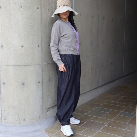 丈はやや短め。ワイドパンツやスカート、ワンピースとも相性がよく、自然とスタイルアップして見える絶妙なバランスです。
