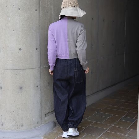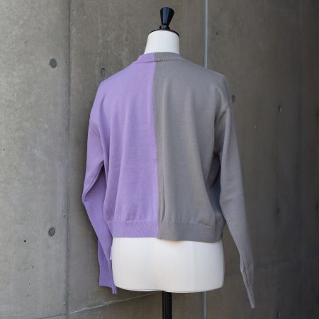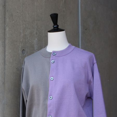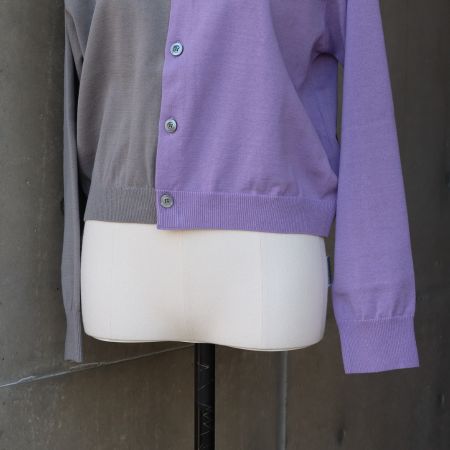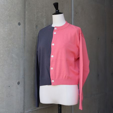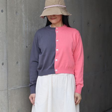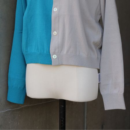 右半身と左半身で色を切り替えた、スノーコットンのバイカラーニットカーディガンです。