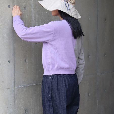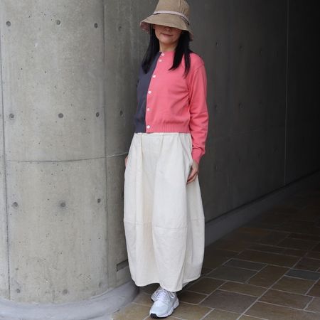 素材にはスノーコットンを使用。ドライタッチで肌離れがよく、さらりと軽い着心地。春先から初夏まで長く活躍します。カーディガンでも重たく見えず、季節感のある軽やかな印象に。