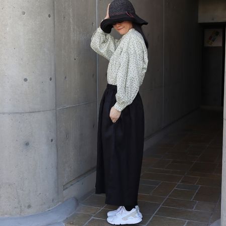 前後にたっぷりと施したギャザーが、動くたびにふんわりと広がるシルエットを演出。身体のラインを優しく包み込み、自然な体型カバーも叶えます。
