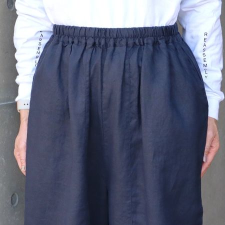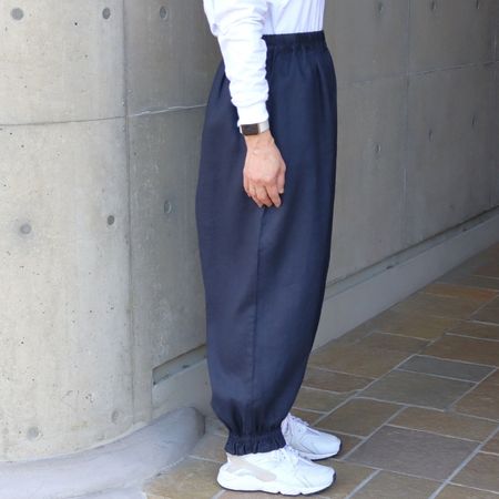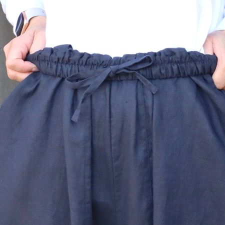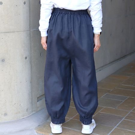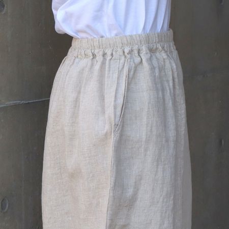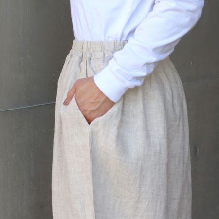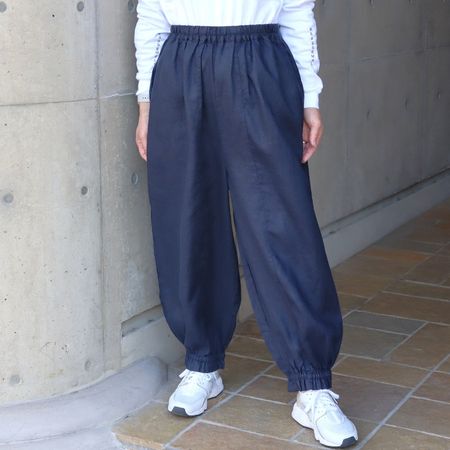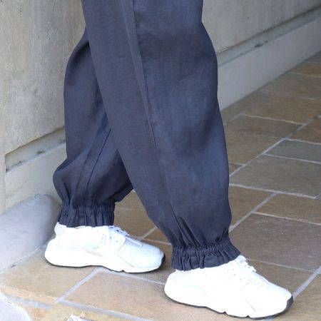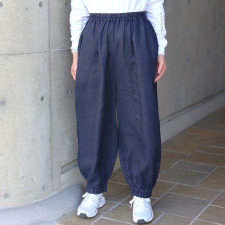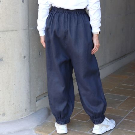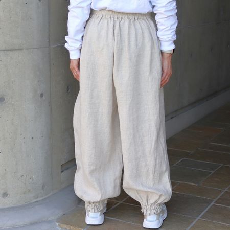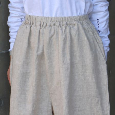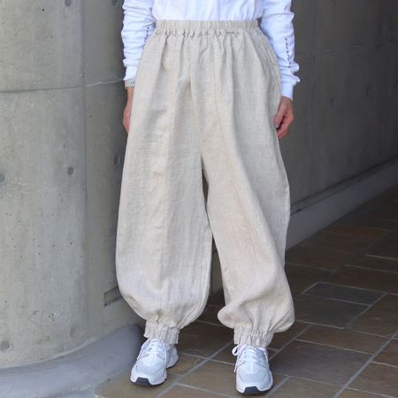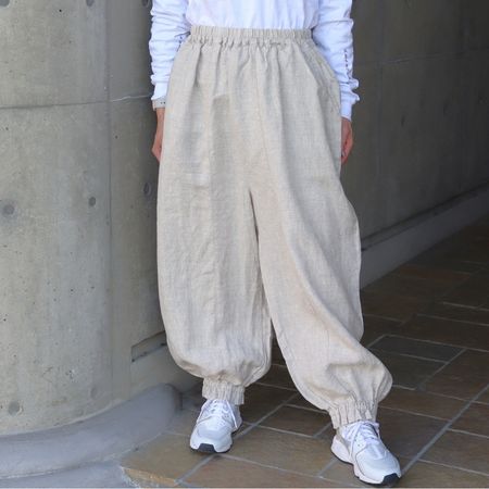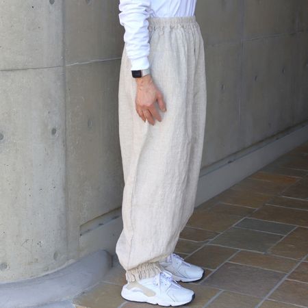 独特のシャリ感を残しながら、やや薄手でなめらかに仕上げた14番手リネンを使用した裾ゴムパンツ。