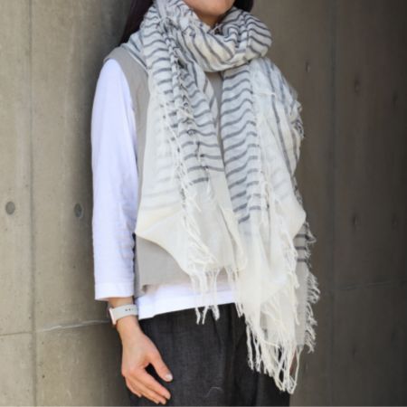 ■絹×麻の混紡糸と、絹×毛の混紡糸――2種類の上質な素材を使い分けて織り上げた、大判のボーダーストールです。